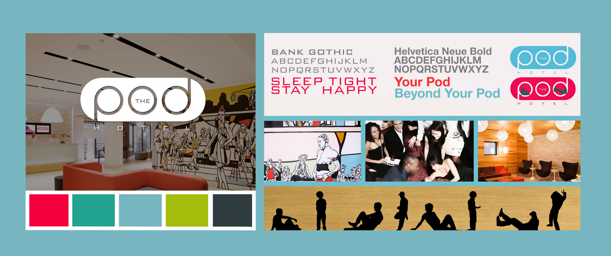 For the name, we selected POD, reminiscent of the mid-century word used to describe the interior space of an airplane in the 50’s + 60’s. The idea of POD is intimate and style forward–a description we used to drive the brand voice and tagline–Sleep Tight, Stay Happy. We chose a vibrant color palette and textures that included wood and metal textures honoring mid-century sensibilities.