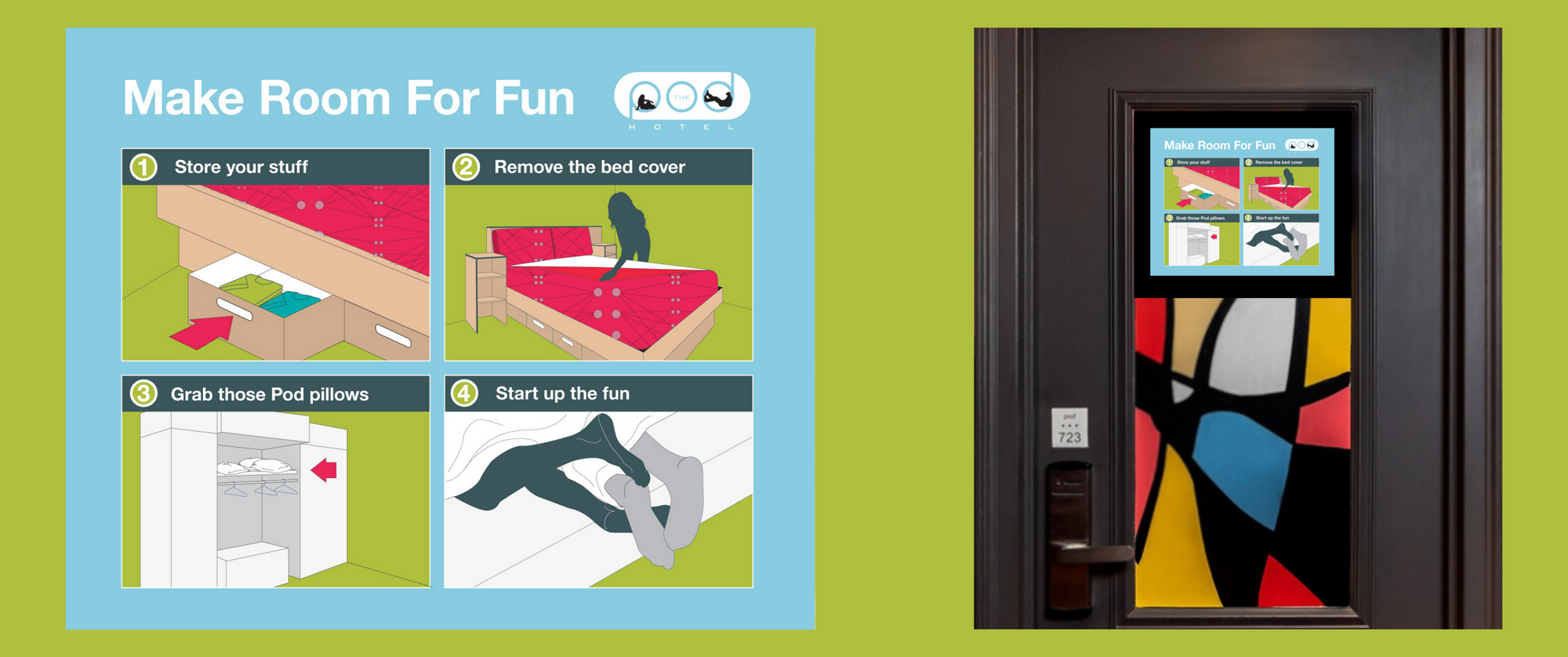 Rebrand a hotel with very tiny rooms that would attract a new, young and international audience without turning off their existing, older audience. The vision of the interior architect, Vanessa Guilford, was to create a mid-century modern design, an homage to Charles Eames and Jean Prouvé, so Far From Timid designed the brand–naming, brand identity, and on-property materials for the hotel that would complement that vision.